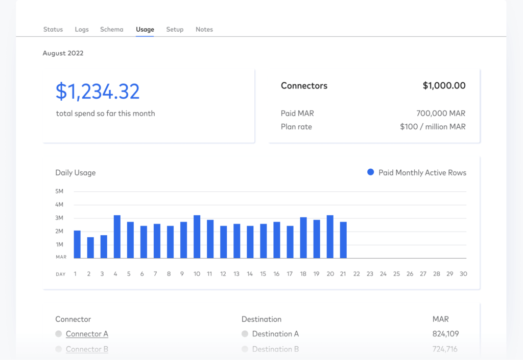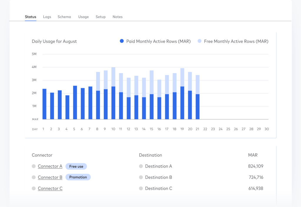 Only pay for monthly active rows (MAR), which are unique primary keys that have been added, deleted or updated by our connectors in your destination.